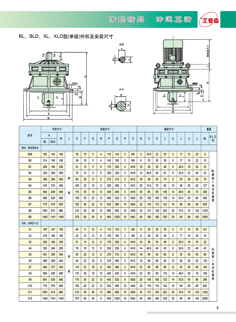 BL立式雙軸型擺線針輪減速機 第一、總述: 擺線針輪減速機全部傳動裝置可分為三部分:輸入部分、減速部分、輸出部分。在輸入軸上裝有一個錯位180的雙偏心套,在偏心套上裝有兩個稱為轉臂的滾柱軸承,形成H機構、兩個擺線輪的中心孔即為偏心套上轉臂軸承的滾道,并由擺線輪與針齒輪上一組環形排列的針齒相嚙合,以組成齒差為一齒的內嚙合減速機構,(為了減小摩擦,在速比小的減速機中,針齒上帶有針齒套)。當輸入軸帶著偏心套轉動一周時,由于擺線輪上齒廓曲線的特點及其受針齒輪上針齒限制之故,擺線輪的運動成為既有公轉又有自轉的平面運動,在輸入軸正轉周時,偏心套亦轉動一周,擺線輪于相反方向轉過一個齒從而得到減速,再借助W輸出機構,將擺線輪的低速自轉運動通過銷軸,傳遞給輸出軸,從而獲得較低的輸出轉速。