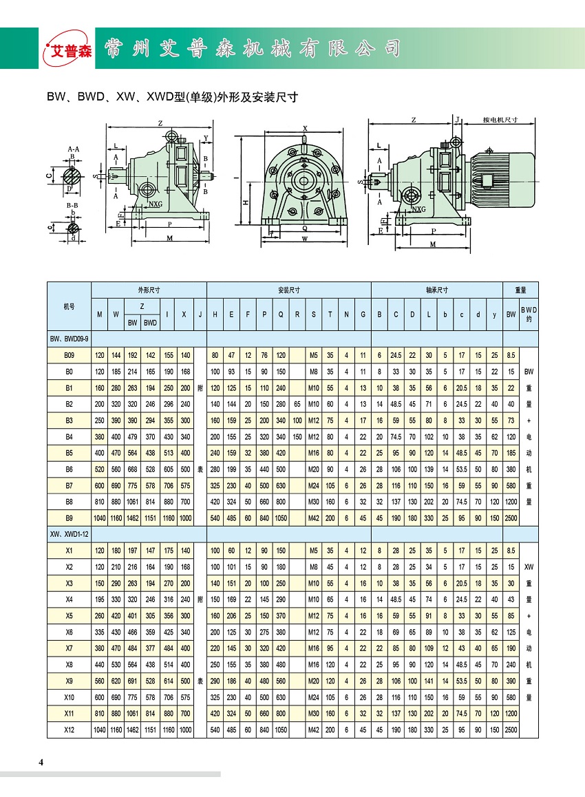 B系列 (化工部標準) 擺線針輪減速機按照電機連接方式定義有以下系列型號: B系列擺線針輪減速機型號大全,B系列擺線減速機分為單級減速機和雙級減速機和三級減速機,安照安裝形式不同分為立式和臥室擺線針輪減速機。下面為您詳細的介紹江蘇減速機市場生產的具體型號: BW擺線針輪減速機(單級臥式雙軸型)型號:BW0、BW1、BW2、BW3、BW4、BW5、BW6、BW7、BW8、BW9、BW10、BW11、BW12 BWY擺線針輪減速機(單級臥式電機法蘭盤直聯)型號:BWY1、BWY2、BWY3、BWK4、BWY5、BWK6、BWY7、BWY8、BWY9、BWY10、BWY11、BWY12 BWD擺線針輪減速機(單級臥式直聯型)型號:BWD1、BWD2、BWD3、BWD4、BWD5、BWD6、BWD7、BWD8、BWD9、BWD10、BWD11、BWD12 BL擺線針輪減速機(單級立式雙軸型)型號:BL0、BL1、BL2、BL3、BL4、BL5、BL6、BL7、BL8、BL9、BL10、BL11、BL12 BLY擺線針輪減速機(單級立式接盤型)型號:BLY1、BLY2、BLY3、BLY4、BLY5、BLY6、BLY7、BLY8、BLY9、BLY10、BLY11、BLY12 BLD擺線針輪減速機(單級立式電機法蘭盤直聯)型號:BLD1、BLD2、BLD3、BLD4、BLD5、BLD6、BLD7、BLD8、BLD9、BLD10、BLD11、BLD12 BWE擺線針輪減速機(雙級臥式雙軸型)型號:BWE20、BWE32、BWE42、BWE53、BWE63、BXWE74、BWE84、BWE85、BWE95、BWE106、BWE128 BWEY擺線針輪減速機(雙級臥式電機法蘭盤連接)型號:BWEY20、BWEY32、BWEY42、BWEY53、BWEY63、BWEY74、BWEY84、BWEY85、BWEY95、BWEY106、BWEY128 BWED擺線針輪減速機(雙級臥式電機法蘭盤連接)型號:BWED20、BWED32、BWED42、BWED53、BWED63、BWED74、BWED84、BWED85、BWED95、BWED106、BWED128 BLE行星擺線針輪減速機(雙級立式雙軸型)型號:BLE20、BLE32、BLE42、BLE53、BLE63、BLE74、BLE84、BLE85、BLE95、BLE106、BLE128 BLEY擺線針輪減速機(雙級立式專用電機直聯型)型號:BLEY20、BLEY32、BLEY42、BLEY53、BLEY63、BLEY74、BLEY84、BLEY85、BLEY95、BLEY106、BLEY128 雙級立式電機直聯型BLED擺線針輪減速機:BLED20、BLED32、BLED42、BLED53、BLED63、BLED74、BLEDK84、BLED85、BLED95、BLED106、BLED128 BWD/XWD擺線針輪減速機實例圖