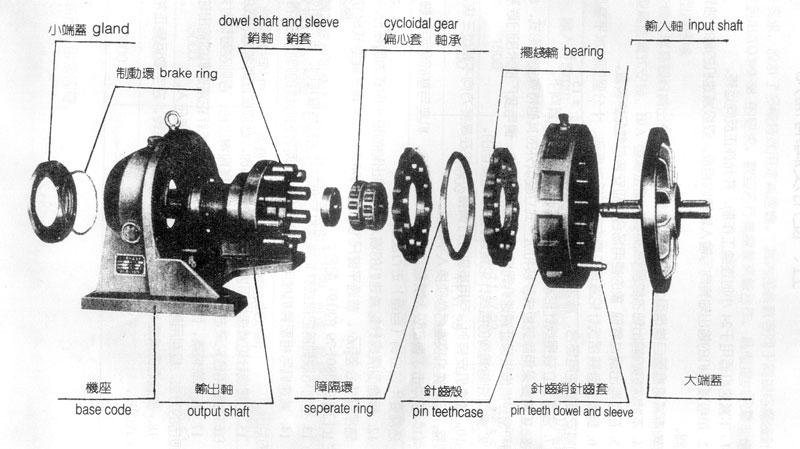 一級XWD臥式擺線針輪減速機全部傳動裝置結(jié)構(gòu)可分為三部分:輸入部分、減速部分、輸出部分,其輸入結(jié)構(gòu)是高速部分,連接輸入電動機(馬達);其輸出部分是減速機的低速部分,其輸出軸通過鏈輪或者聯(lián)軸器、連接盤等接入用戶需要帶動的設備。