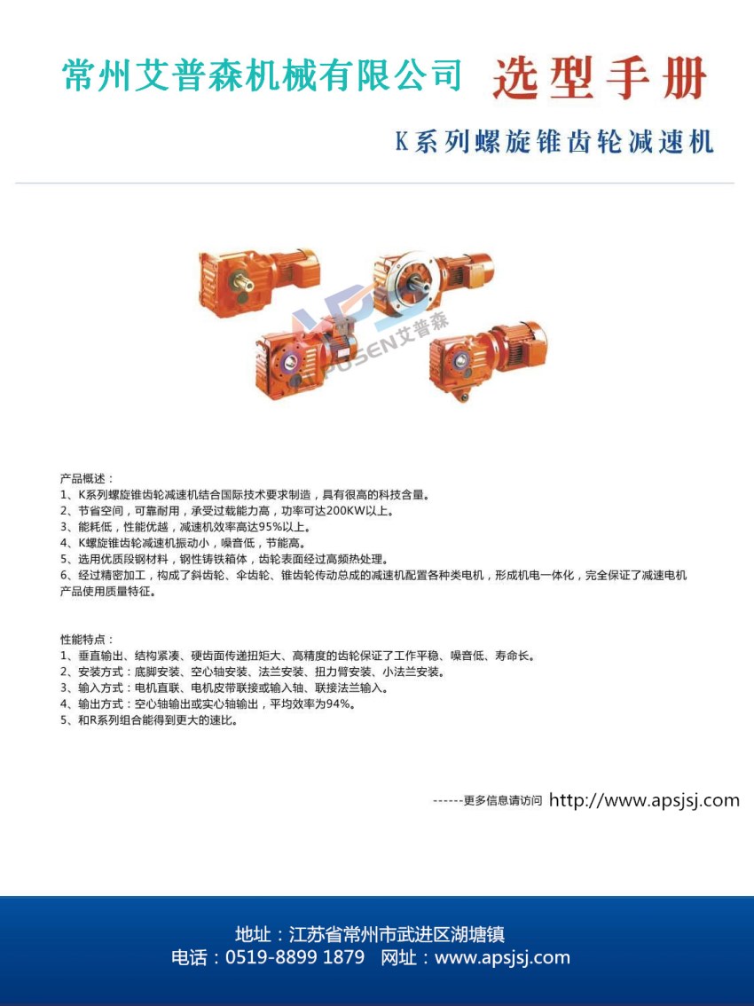 1、K系列螺旋錐齒輪減速機振動小,噪音低,節能高。